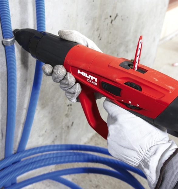 Direct Fastening (DX) is the ultimate cordless fastening systems designed with productivity in mind. DX fastening methods can reduce labour time by as much as 65% and installation costs by 36%. Hilti Direct Fastening is an innovative system that will make a large number of fixings quickly and safely with no need for power supplies or skilled labour. The productivity features includes making in excess of 1000 fixings per day, fixing into a wide range of base materials including steel and concrete, Integrates with HILTI positioning systems to save marking out time and Specialist fasteners available to suit different trades.